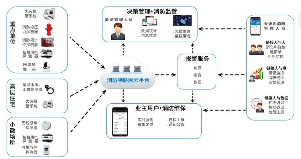 智能消防和智慧消防有什么區(qū)別呢?智能≠智慧,所以智能消防≠智慧消防。智慧消防是基于智能消防+互聯(lián)消防。“互聯(lián)網(wǎng)消防”功能比較單一,只是單純的把傳統(tǒng)消防產(chǎn)品鏈接傳至云端,然后對安裝場所實施全方位的監(jiān)控。“智能消防”比起互聯(lián)網(wǎng)消防更優(yōu)化一點,它有思考的能力,集成了現(xiàn)代的傳感技術(shù),對安裝區(qū)域周邊的環(huán)境做到了智能傳輸以及邏輯分析,減少錯誤信息的傳遞。而智慧消防=智能消防+互聯(lián)消防,運用先進的物聯(lián)網(wǎng)技術(shù),把不同場景與人聯(lián)系在一起,并依靠大數(shù)據(jù)分析提供科學(xué)的判斷。就行業(yè)發(fā)展而言,傳統(tǒng)消防擁抱數(shù)字化不是選擇,更像是唯一出路。